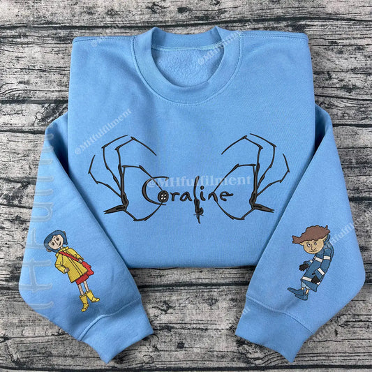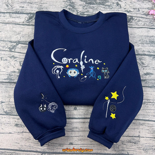 Coraline Embroidered Crewneck, Horror Doll Cartoon Movie Shirt, Halloween 3D Doll Embroidered sweatshirt , Scary Doll Halloween Embroidered Shirt, Cartoon Character Hoodie