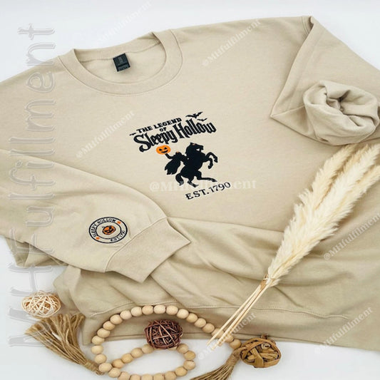 Sleepy Hollow Embroidered Sweatshirt β Headless Rider Halloween Crewneck, Pumpkin Sleeve, Spooky Season Fall Shirt