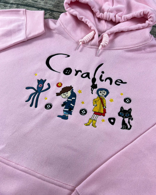 Halloween Coraline and Wybie Embroidered Sweatshirt β Scary Doll Hoodie, Horror Cartoon Character Hoodie for Spooky Season