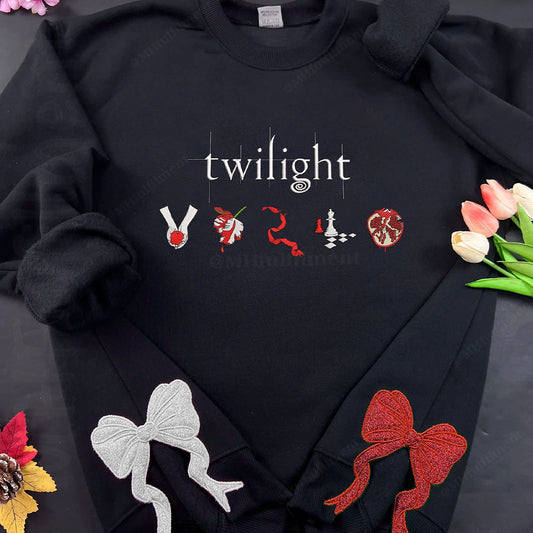 Twilight Side Bow Embroidered Sweatshirt β Book Cover-Inspired Applique Crewneck for Vampire & Fantasy Lovers
