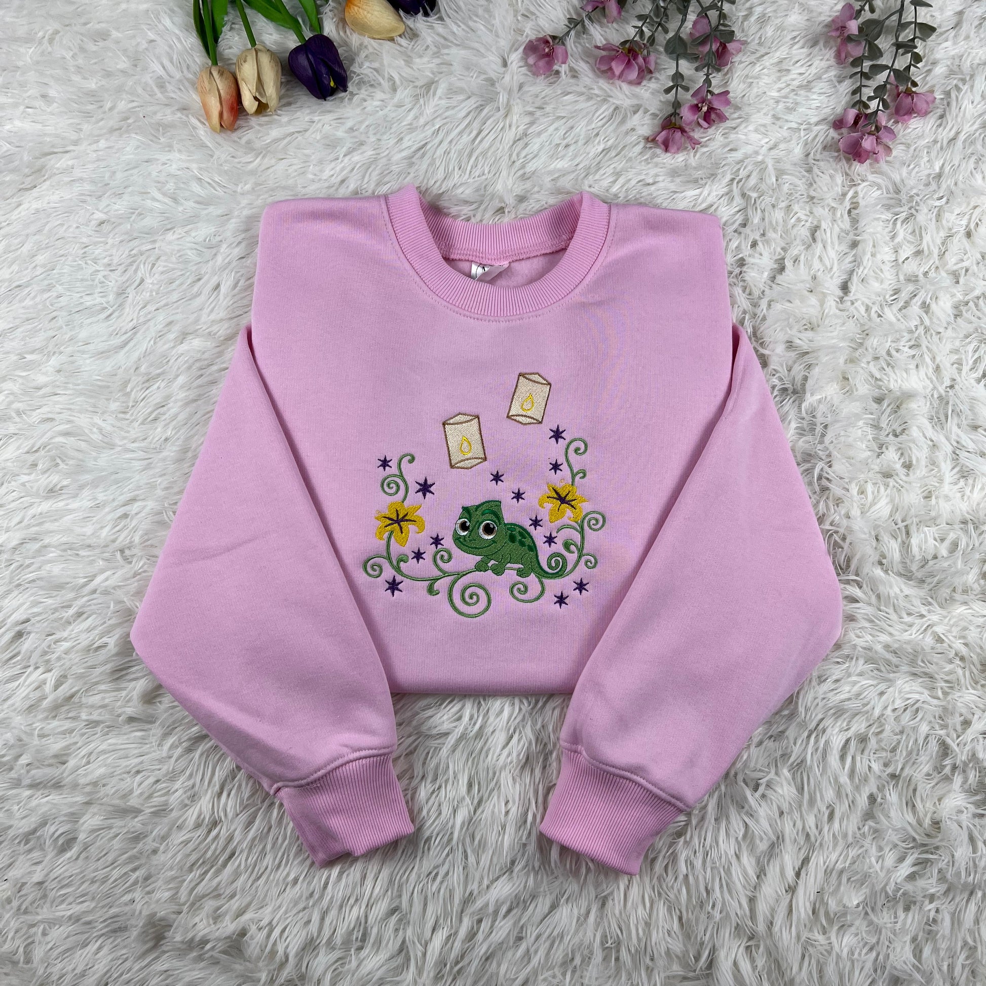 Bring a little storybook magic into everyday life with the Pascal Chameleon Lantern Embroidered Pink Crewneck Sweatshirt, a whimsical embroidered piece inspired by one of the most beloved animated fairytale adventures.