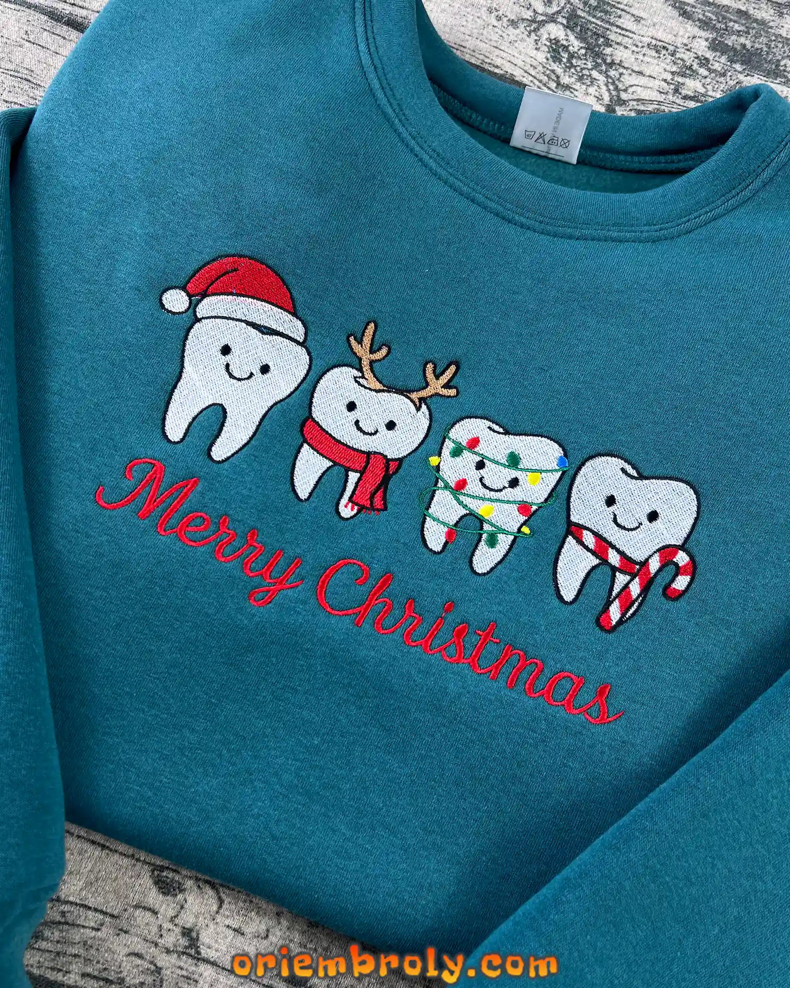 Celebrate the holiday season with a playful twist in our Christmas Dentist Embroidered Sweatshirt. Featuring chest-only embroidery, this design blends charming tooth illustrations with festive Christmas elements — finished with a cheerful “Merry Christmas” detail that adds warmth and personality to your winter look.