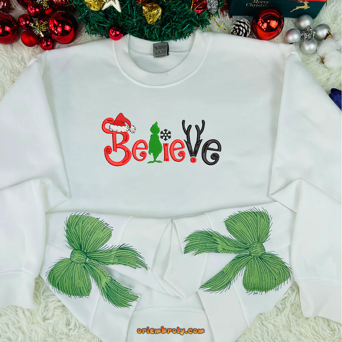 Christmas Believe embroidered sweatshirt with side bow, Merry Xmas Embroidery Pullover, Happy Winter Season Gift