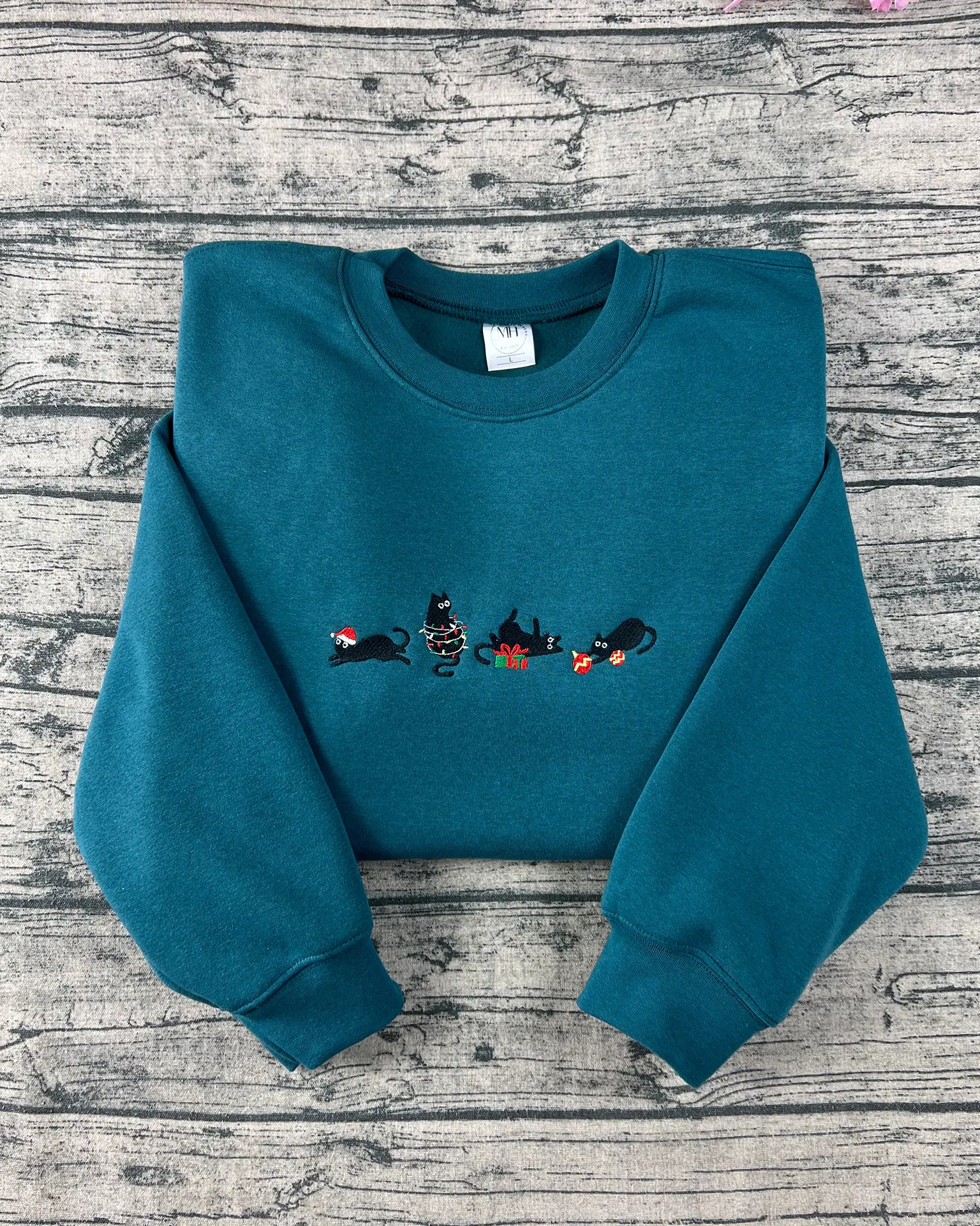 Add a touch of festive charm to your winter look with our Christmas Cat Embroidered Sweatshirt — a cozy, playful piece for cat lovers and holiday dreamers alike. Featuring a sweet embroidered cat dressed for the season, this sweatshirt captures the warmth, fun, and whimsy of Christmas without being over the top.