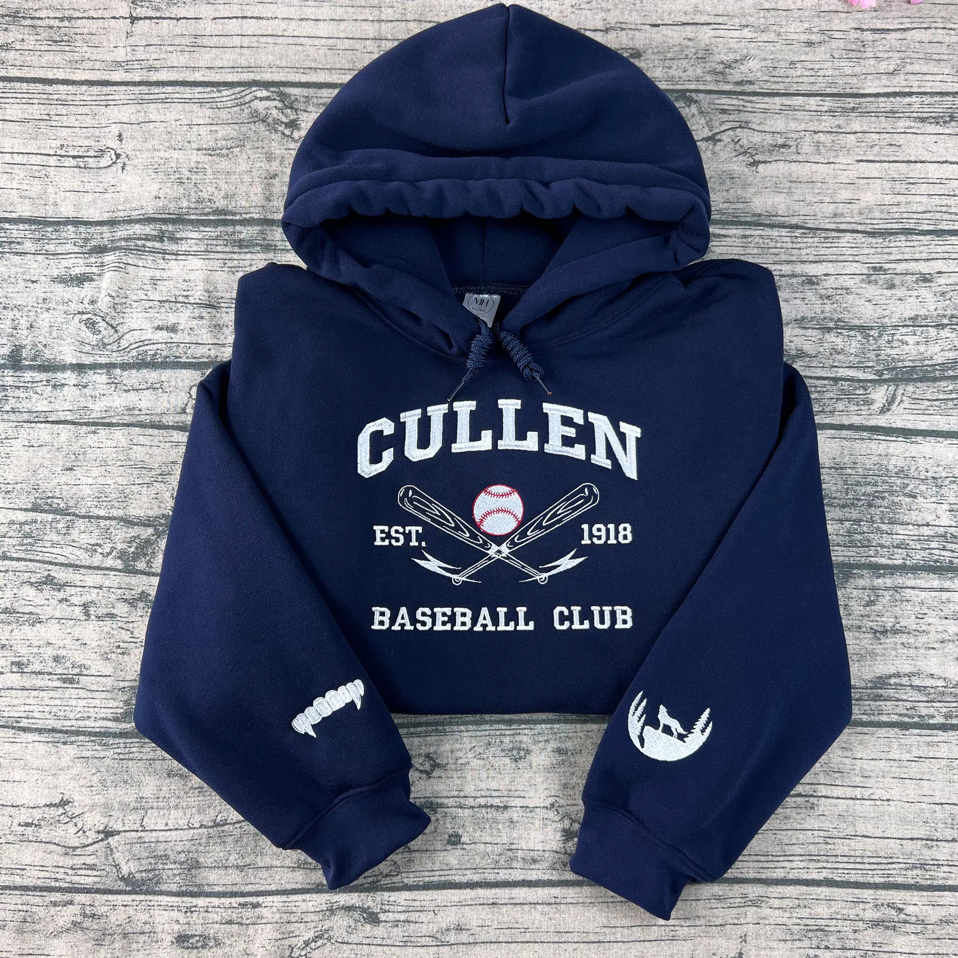 Step into the world of Twilight with our Cullen Baseball Embroidered Sweatshirt – a must-have for every fan of Forks, vampires, and timeless love stories. Inspired by the iconic Cullen family baseball scene, this sweatshirt features detailed embroidery and a fang detail on the sleeve, making it the ultimate piece for Team Edward or Team Jacob supporters.