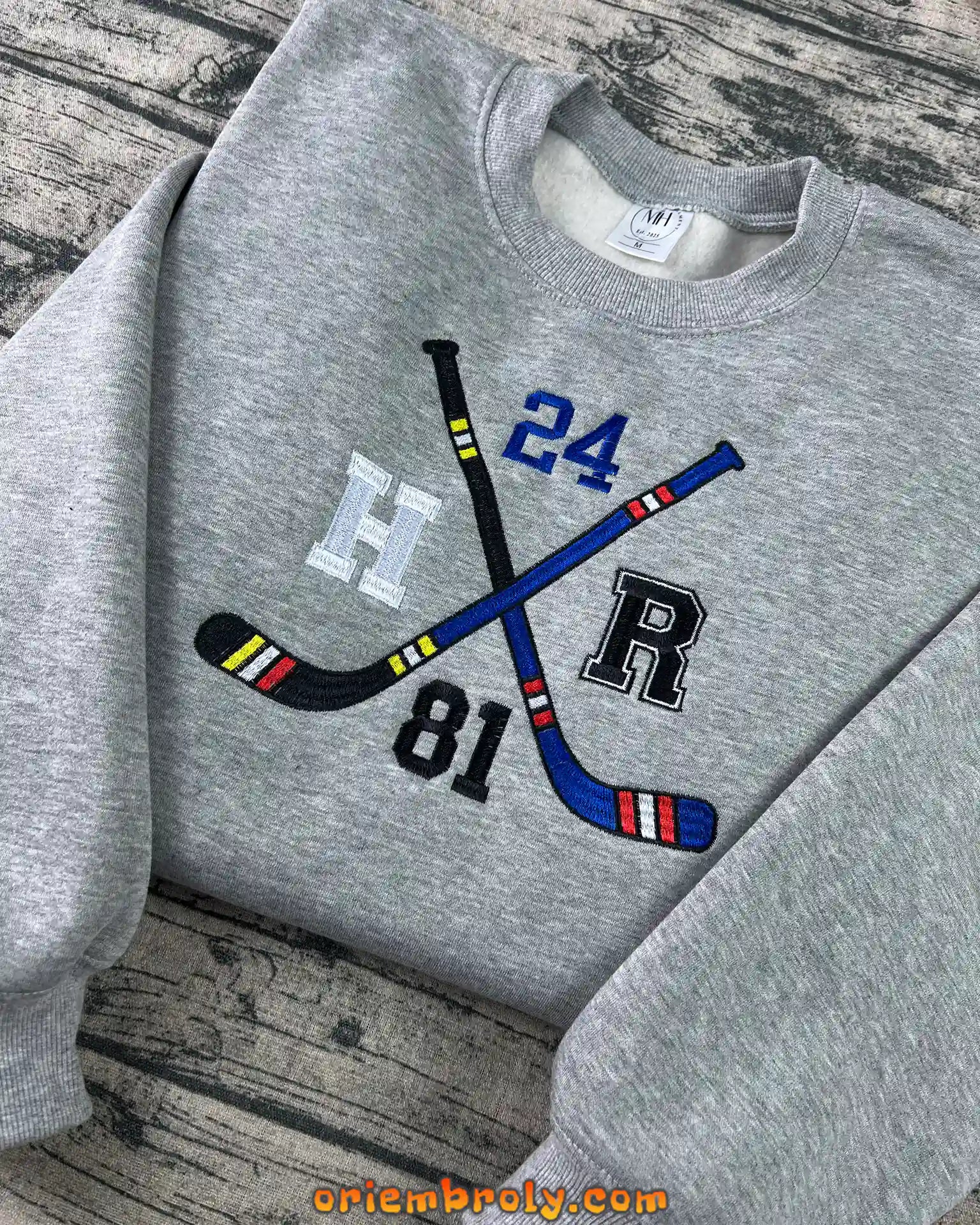 • Sleeve embroidery with crossed hockey sticks, puck, and numbers 24 & 81