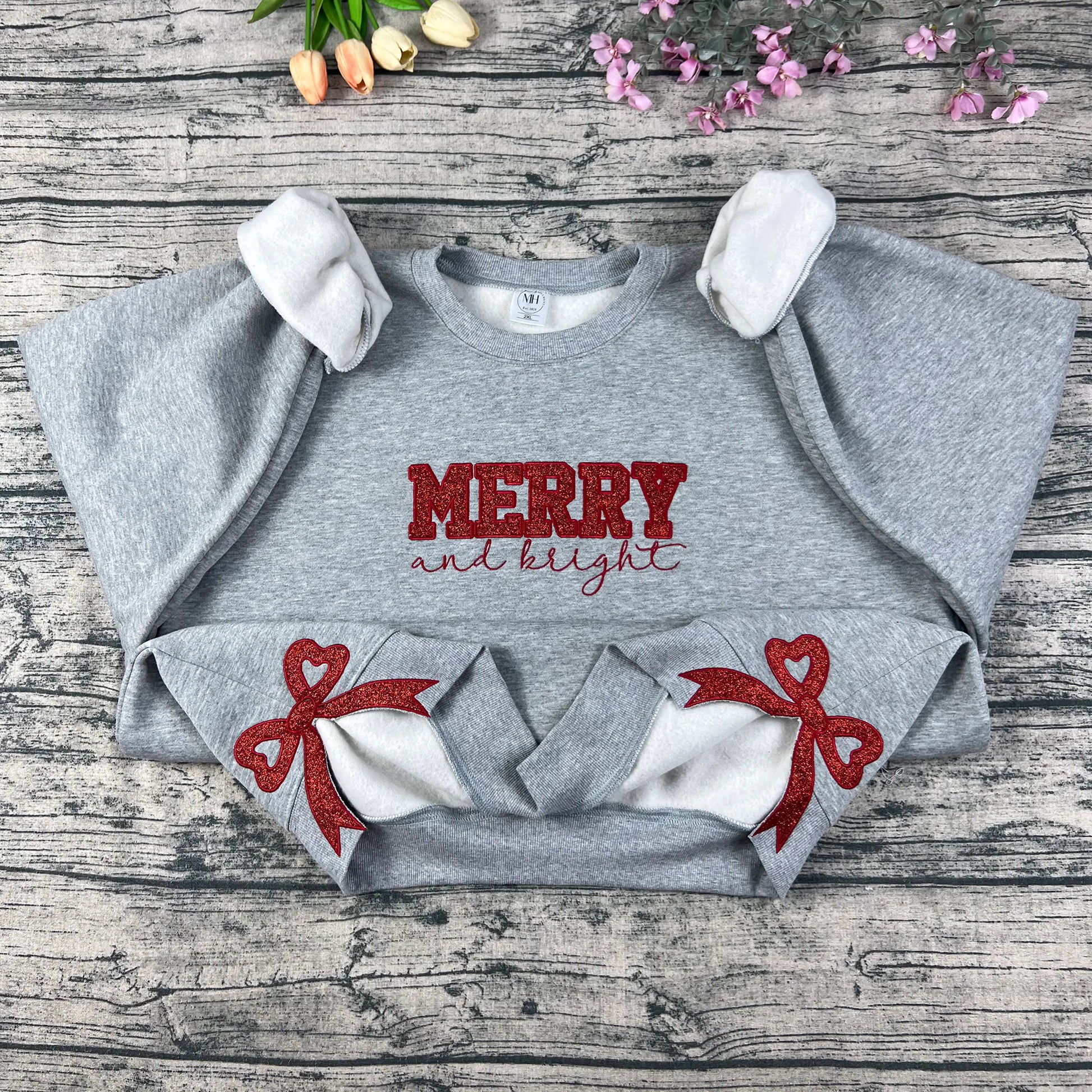 Merry and Bright Glitter Embroidered Bow Sweatshirt – Festive Holiday Sparkle Edition