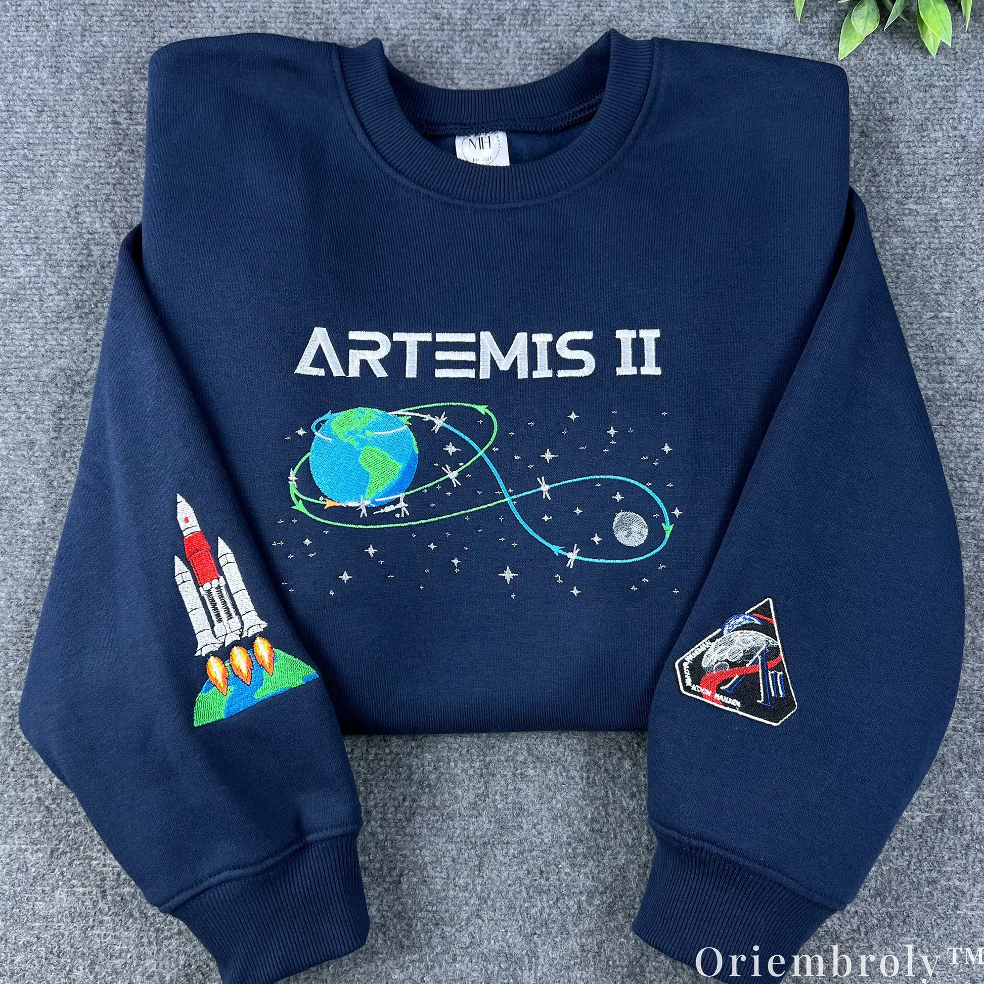 This navy pullover features a detailed multi-part embroidery, with “ARTEMIS II” displayed in a bold futuristic font above a precise Earth–Moon orbital trajectory design. The composition captures the technical beauty of space missions while maintaining a clean, wearable layout.