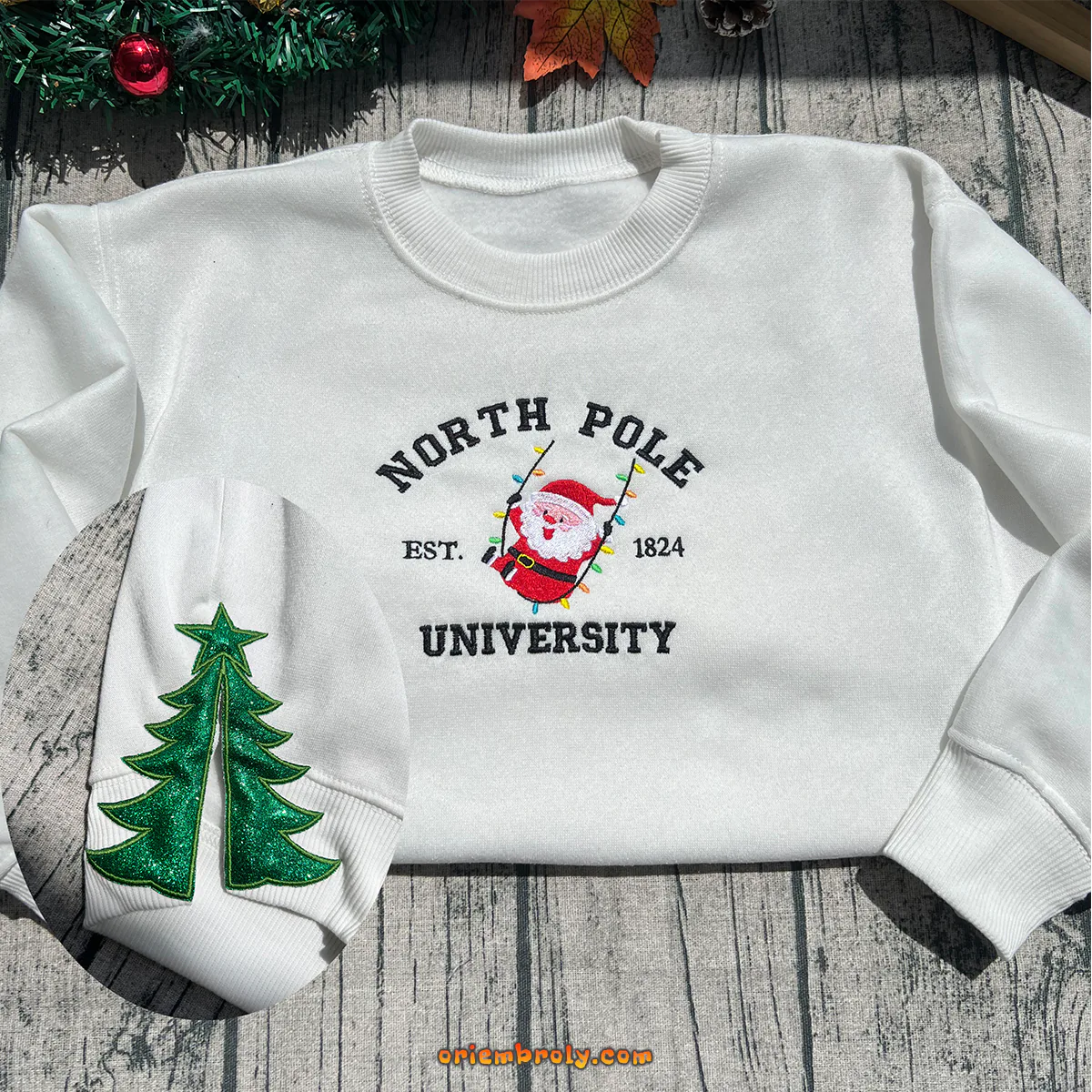 Premium embroidery: Santa, North Pole, and side bow design