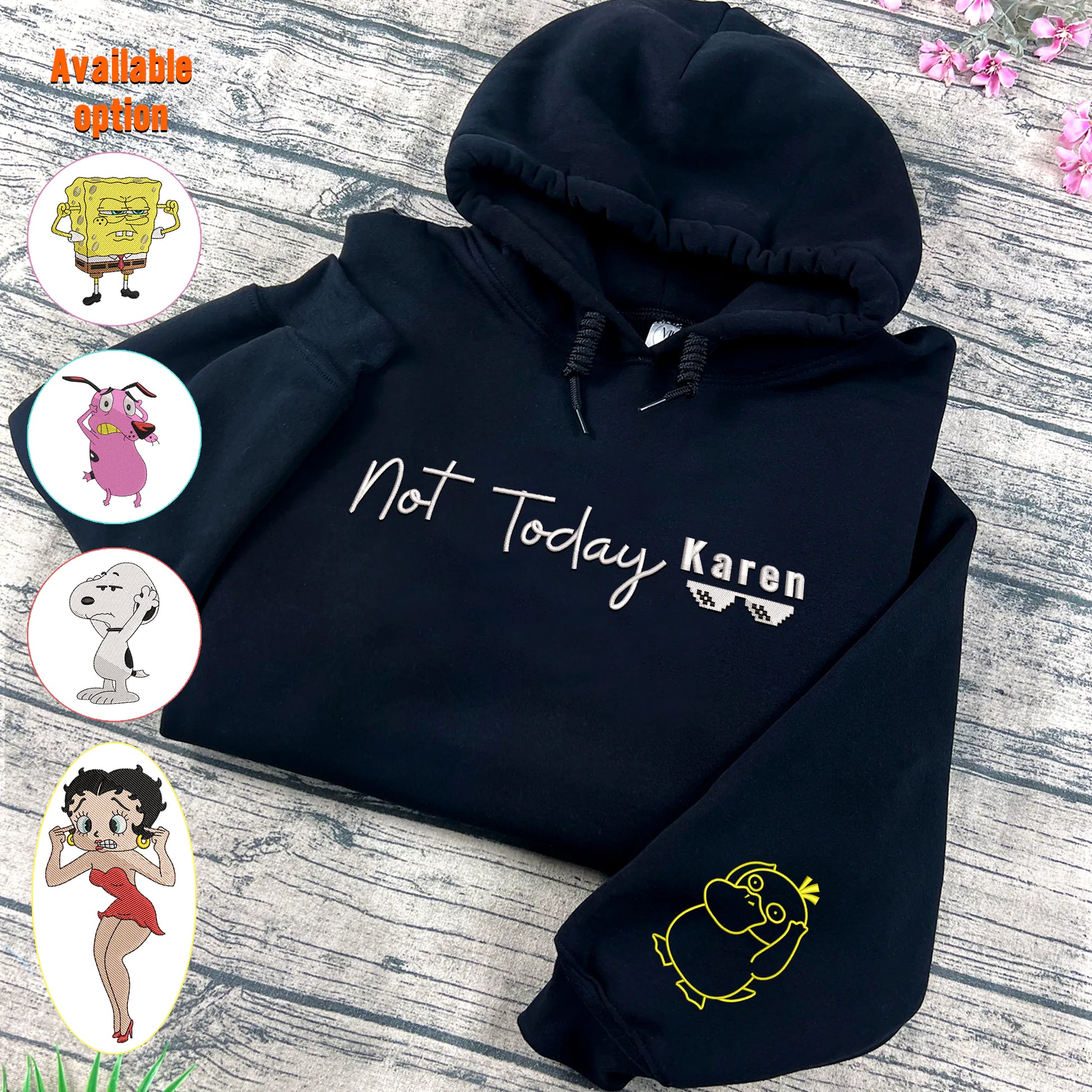 Not Today Karen Embroidered Hoodie – Funny Meme Sweatshirt with Psyduck Embroidery, Trendy Black Hoodie Gift for Gamers & Anime Fans