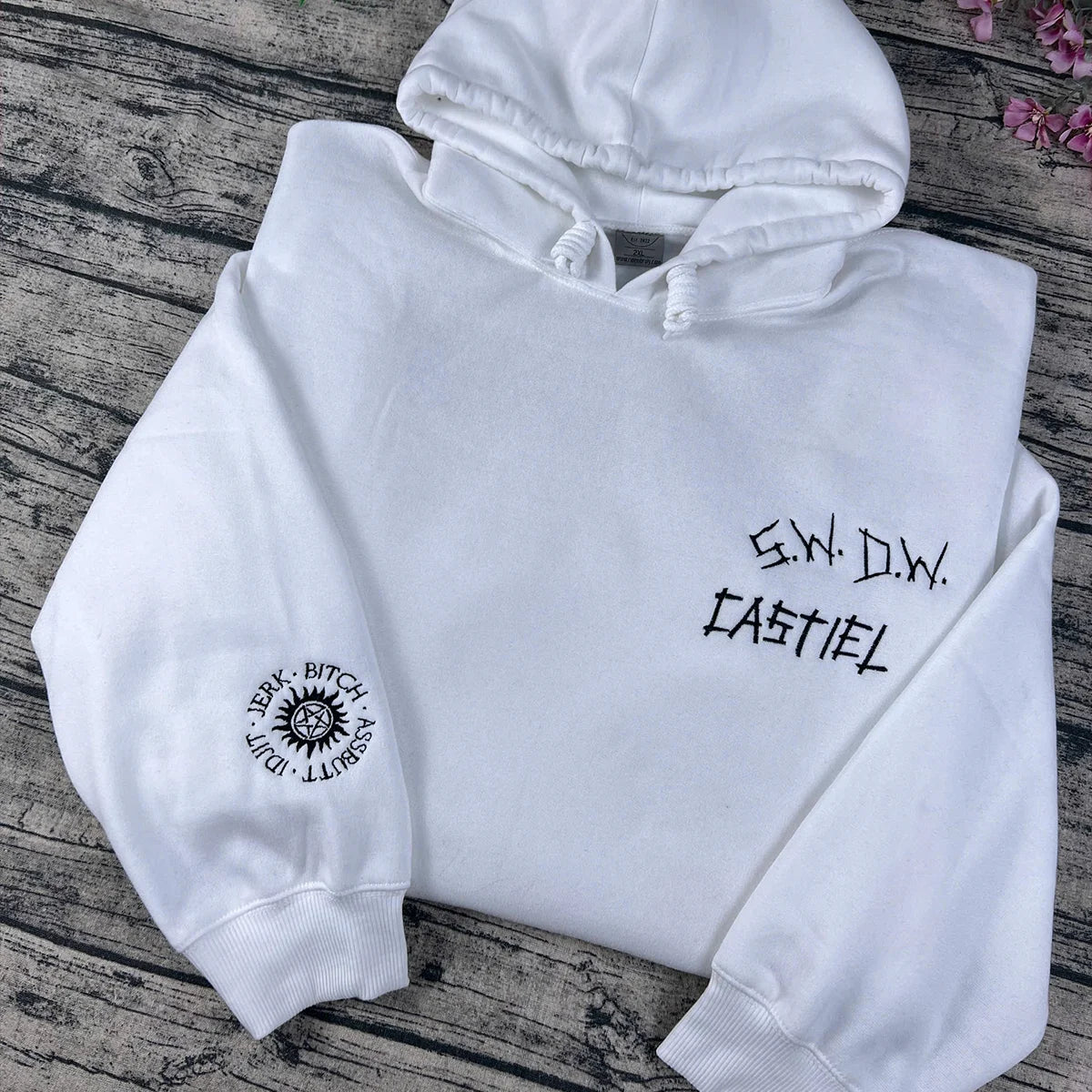 Channel your inner hunter with this Supernatural Embroidered Sweatshirt, a must-have for every fan of the Winchester brothers! This detailed unisex hoodie features embroidered symbols and icons inspired by Dean Winchester, Sam Winchester, Castiel, and the legendary Chevy Impala "Baby".