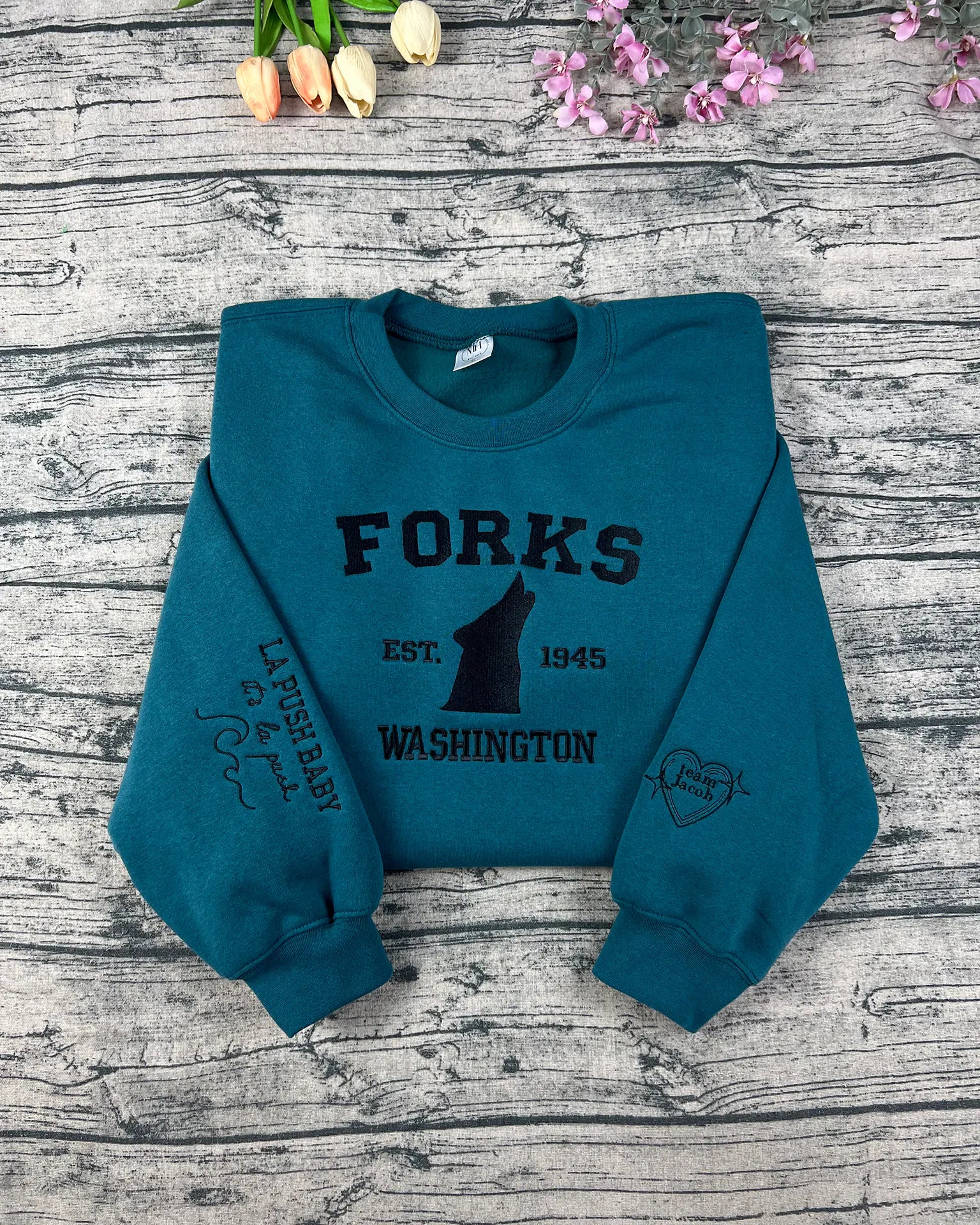 Step into the misty, enchanting world of Forks with our Twilight Sweatshirt: Forks Washington. Featuring a delicate chest embroidery inspired by the quiet, rain-soaked streets and forested landscapes of this iconic town, this sweatshirt captures the serene, mysterious charm that fans of the saga know and love. The stitching subtly blends soft, flowing lines with symbolic elements to evoke themes of twilight skies, hidden depths, and quiet strength. Perfect for lovers of atmospheric storytelling, iconic locations, and cozy, story-rich style, this piece brings a whisper of magic to your everyday wardrobe.